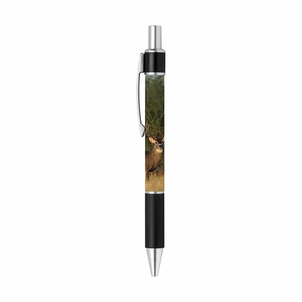 A buck deer in full color decorates the barrel of this ballpoint pen that writes in black ink. An attached silver clip for easy carrying with a black rubber base for a comfortable writing grip. Pen is packaged in a clear plastic box ideal for gift gifting.