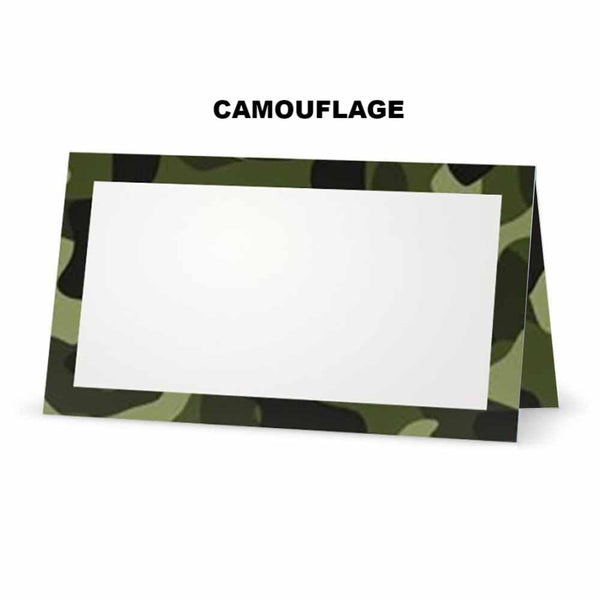 Tent style place cards with camouflage on topside and backside. Cards fold to stand alone on table or can be placed into place card holders. Cards ship flat and are pre-scored to fold easily. Folded size is approximately 3 1/2" wide x 2" high. Plenty of space so you can handwrite a name, table number, or any message. Available in 10 or 50 Packs.