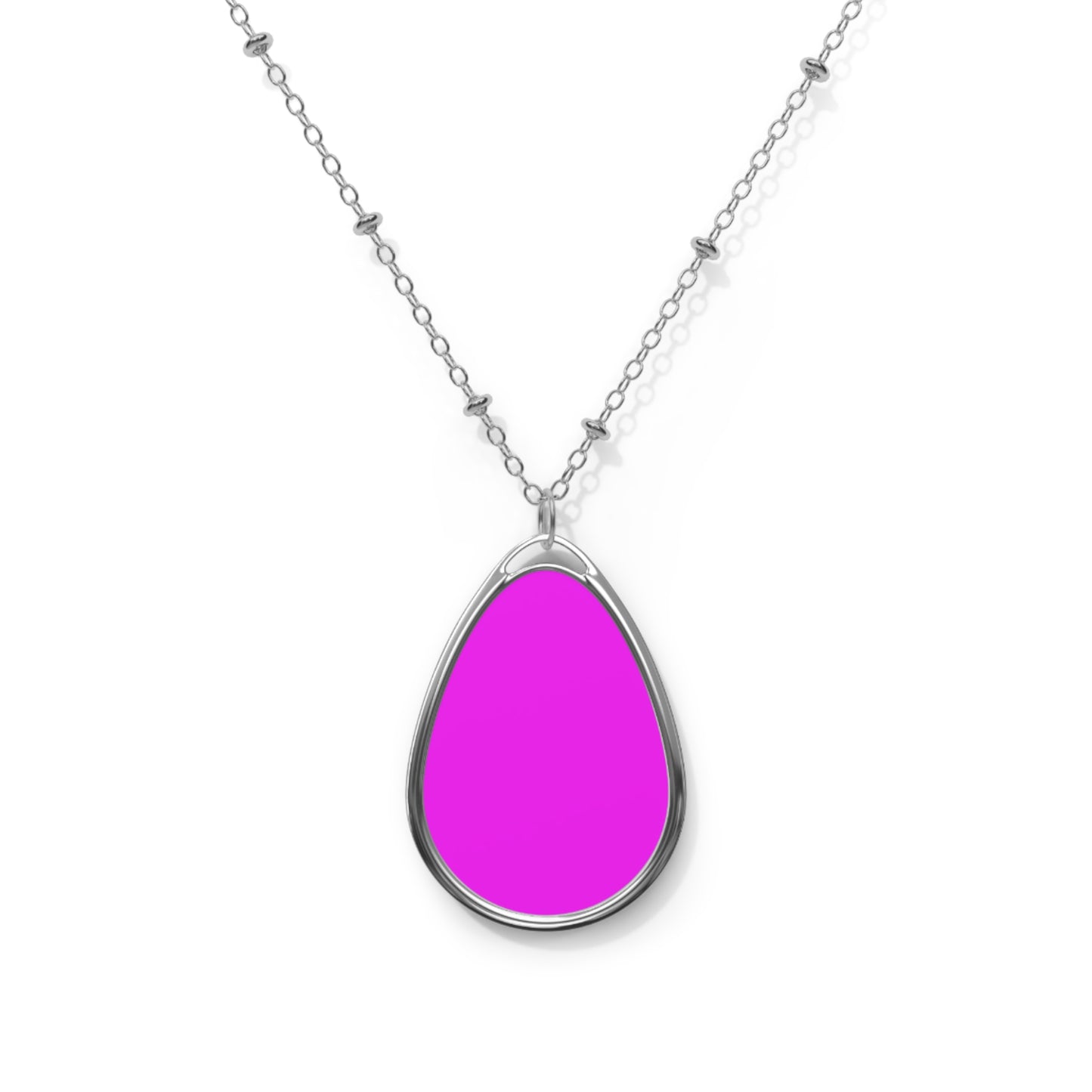 This fuchsia color pendant and its chain are made with a robust zinc alloy for dazzling looks that are long-lasting. The print panel is made with aluminum while the pendant itself comes in a unique shape of an ellipse.