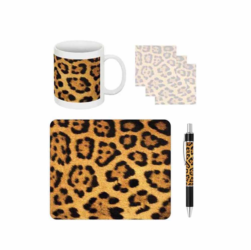 This desk set with leopard animal print design is perfect for the home or business office. Includes one mouse pad, one 11 ounce mug, one pen, and one set of three sticky note pads. Packaged together in a clear box for gift giving.