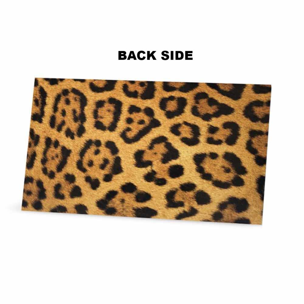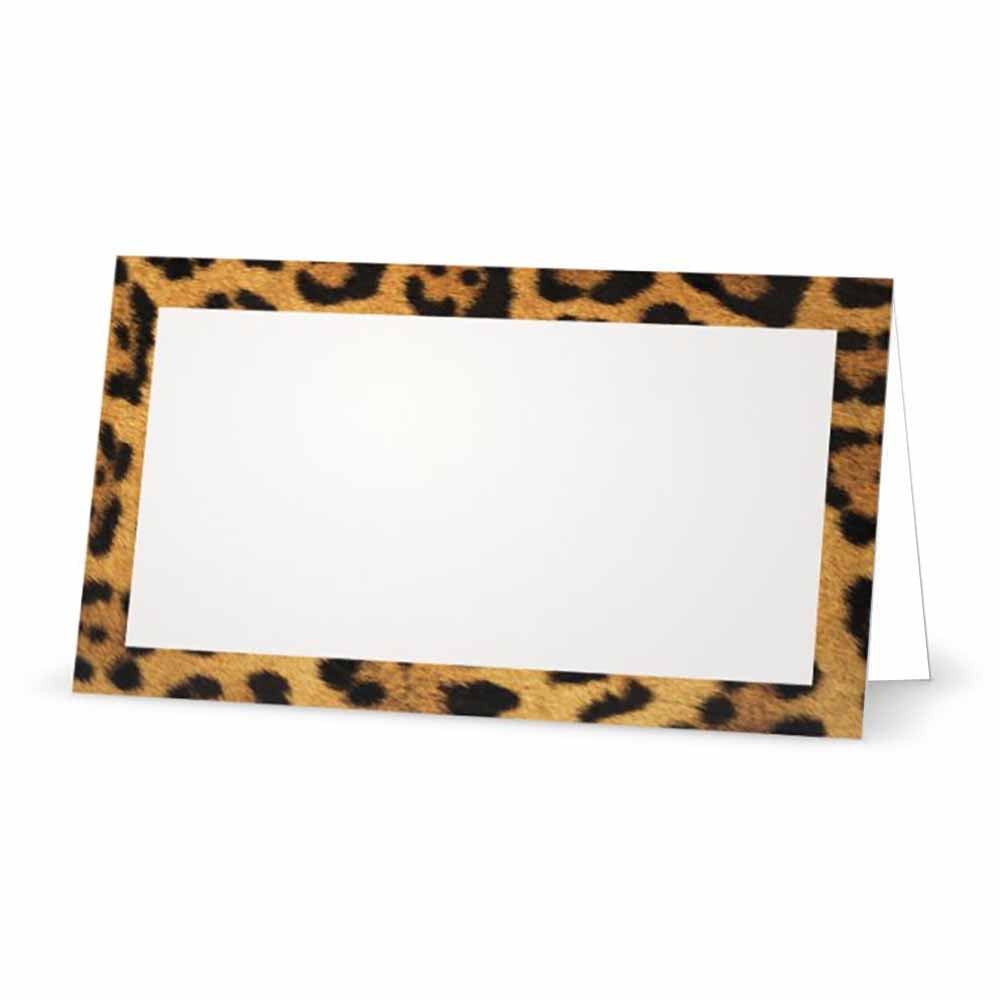 Leopard animal print place cards ideal for weddings, bridal events, baby showers, birthdays, celebration events, banquet and catering food dishes. Underside of cards are white so can use as mini note cards, gift tags, food labels. Cards are 3.5" x 2" when folded. Cards ship unfolded. 110 lb. weight card stock.