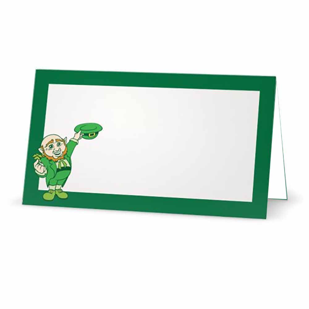 Tent style leprechaun on green place cards come standard with white on underside. Cards fold to stand alone on table or can be placed into place card holders. Cards ship flat and are pre-scored to fold easily. Folded size is approximately 3 1/2" wide x 2" high. Plenty of space so you can handwrite a name, table number, or any message. Set of 10 OR