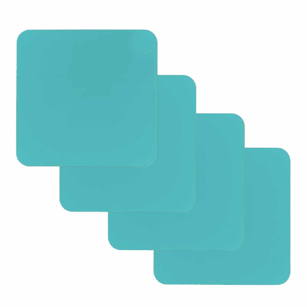 Set your drinks on these glossy solid misty blue color coasters for your home or office to protect your desk or table top surfaces. Cork on back to keep from slipping and to prevent scratches. 4" x 4" square. Boxed set of four.