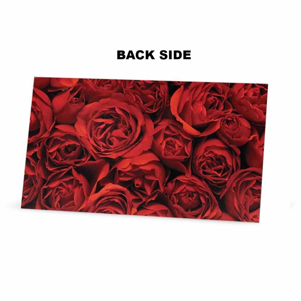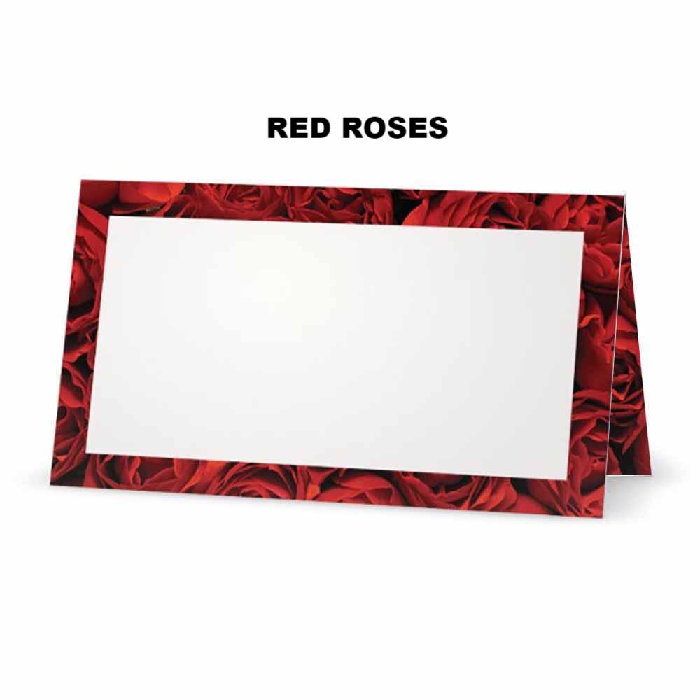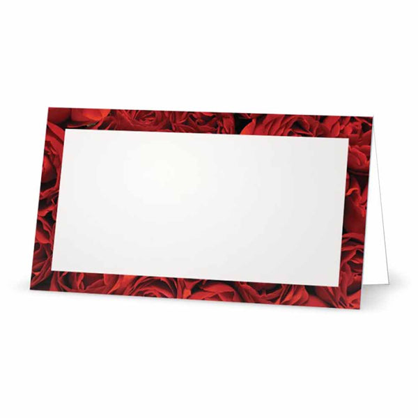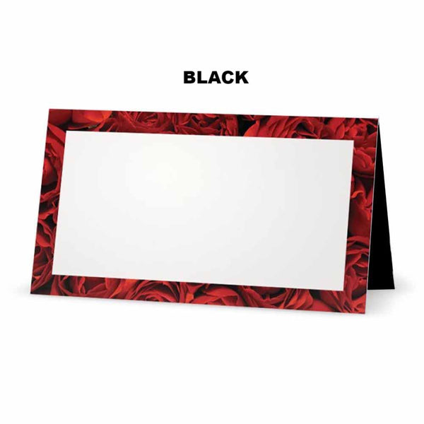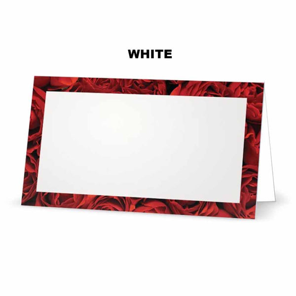 Our tent style place cards with red roses on topside come standard with white underside. Other underside colors available in black and red rose print. Cards fold to stand alone on table or can be placed into place card holders. Cards ship flat and are pre-scored to fold easily. Folded size is approximately 3 1/2" wide x 2" high. Plenty of space so you can handwrite a name, table number, or any message. Set of 14 cards.