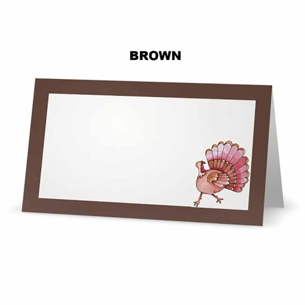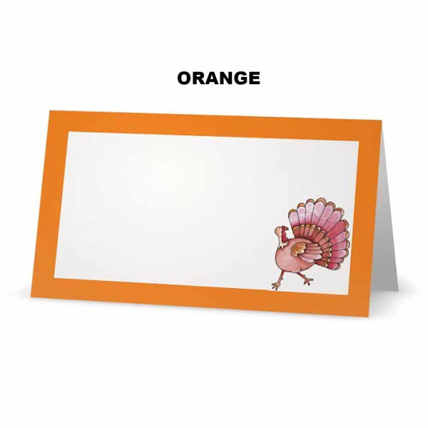 Turkey tent style place cards with white underside. Cards fold to stand alone on table or can be placed into place card holders. Cards ship flat and are pre-scored to fold easily. Plenty of space so you can handwrite a name, table number, or any message. Set of 10 cards. Folded size is approximately 3 1/2" wide x 2" high.