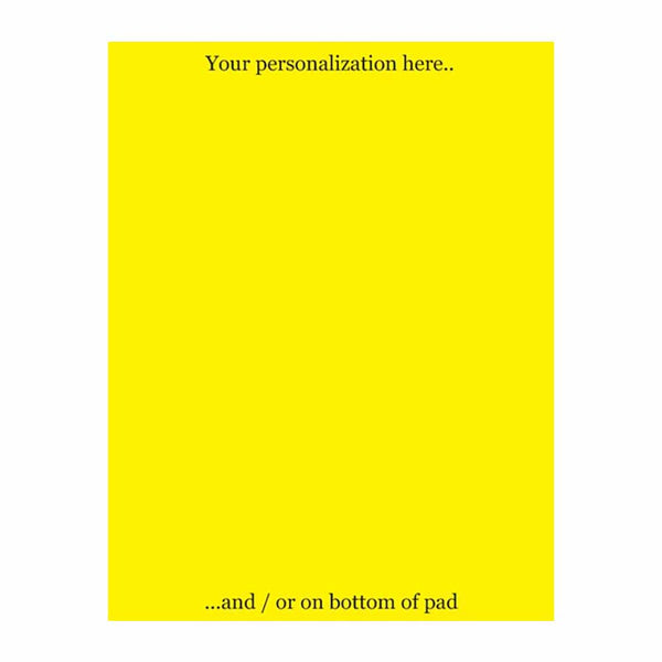 Pink color note pads available blank or personalized. Option to place text on top and/or bottom with up to 32 characters and spaces. Set of 2 with 50 sheets per pad. Acid-free. 28 lb weight Paper. 92 Brightness. Font colors in black, white, red, blue, lavender, lime, orange, ivory, purple, yellow, turquoise, fuchsia, gray, brown, and navy. Each pad is 4.25 inches wide x 5.50 high.
